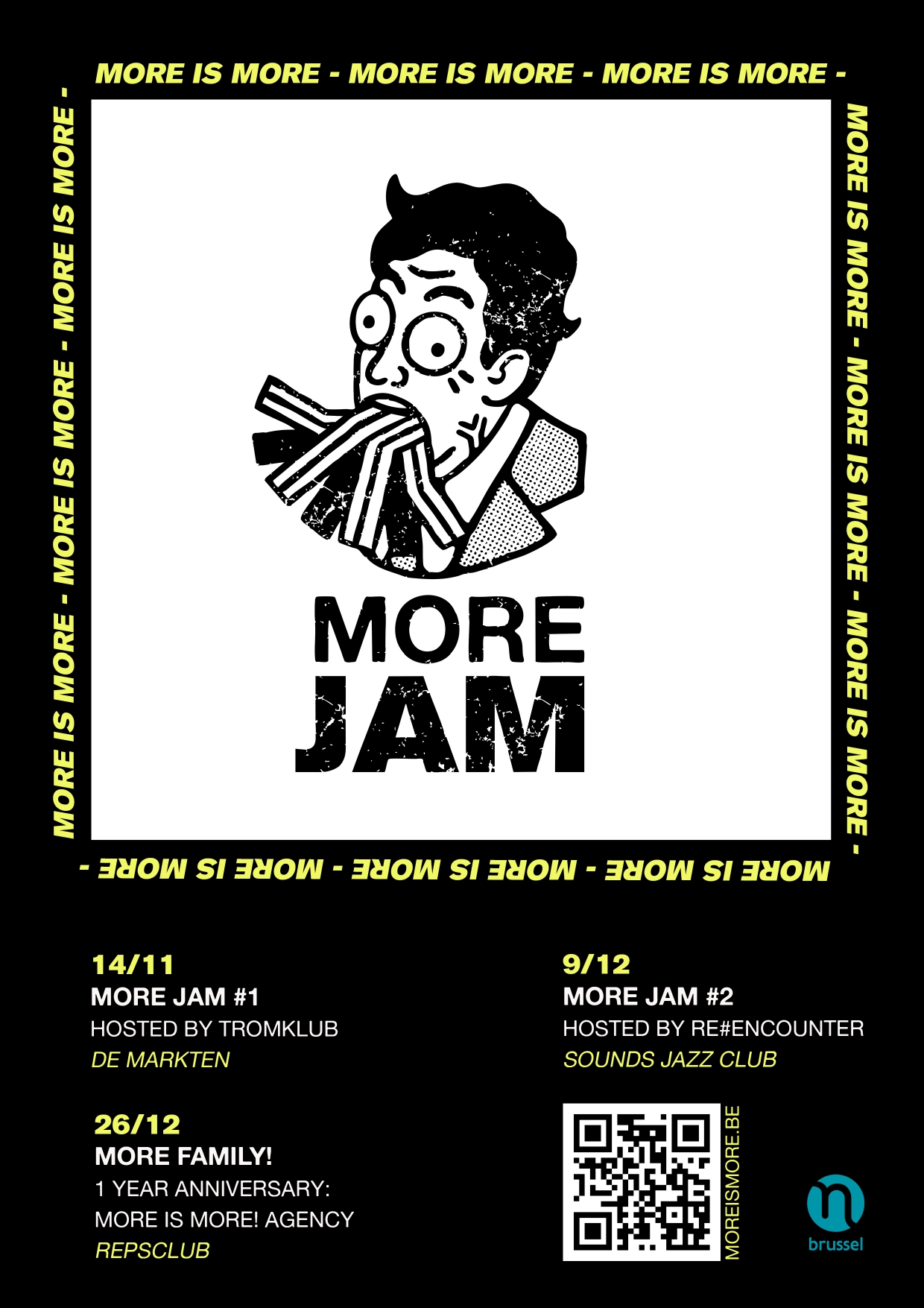 Brussels-based musicians Jan Heirman and Robbe Bey Latré collaborate since 2017 in a variety of projects. Since then, they are slowly metamorphosing into each other, turning into a highly creative and efficient monster with a left brain that is as well developed as its right brain. In 2024 they decided to give it a name, MORE IS MORE Agency, and let it work for the benefit of their projects and colleagues in Brussels and beyond.